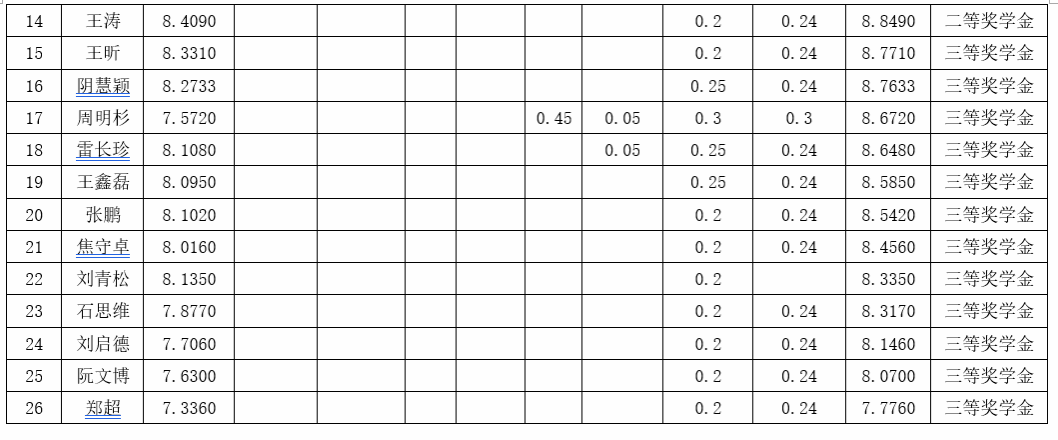 根据《春满四合院 研究生奖(助)学金评定办法》,按综合成绩排名确定最终获奖类别(综合成绩=学业成果成绩+思想道德素质评价成绩+第二学年综合成绩*10%),现将2021级2022-2023学年研究生学业奖学金获奖名单公示如下: