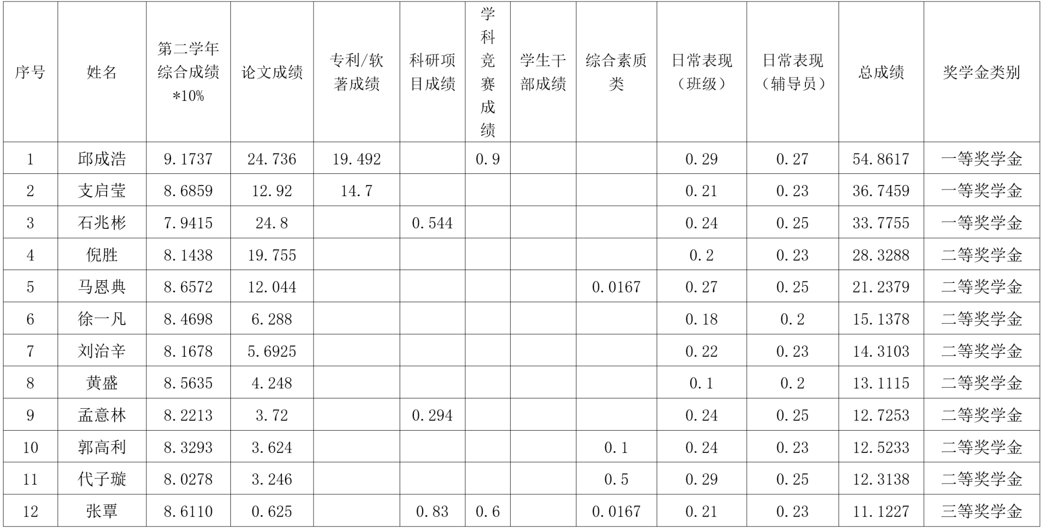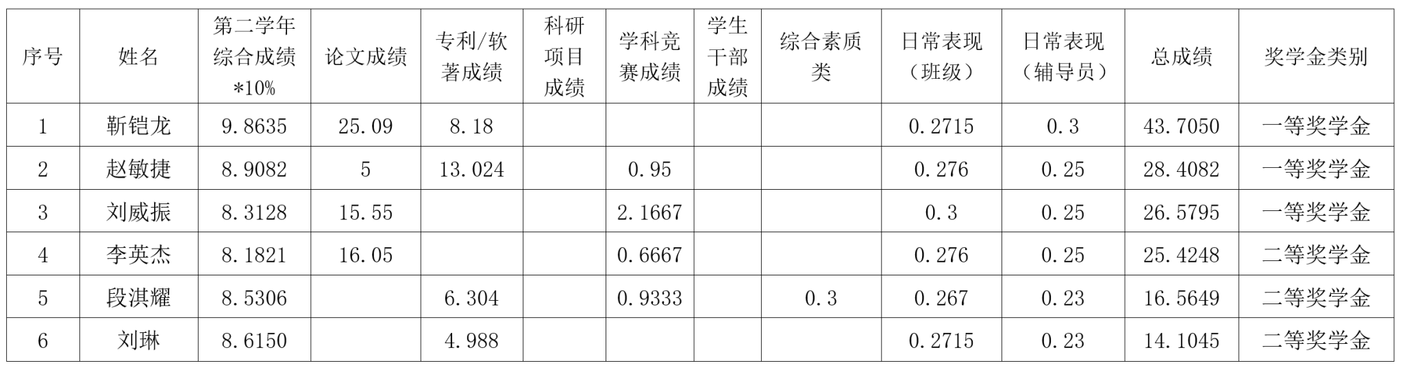 根据《春满四合院 研究生奖(助)学金评定办法》,按综合成绩排名确定最终获奖类别(综合成绩=学业成果成绩+思想道德素质评价成绩+第二学年综合成绩*10%),现将2022级2023-2024学年研究生学业奖学金获奖名单公示如下