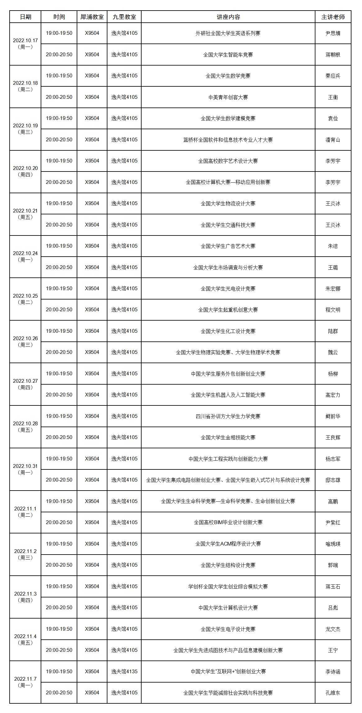 教务处主办、西南交大创新创业俱乐部承办的 2022—2023学年第一学期学科竞赛及创新创业活动讲座活动于2022年10月17日—2022年11月7日举行。