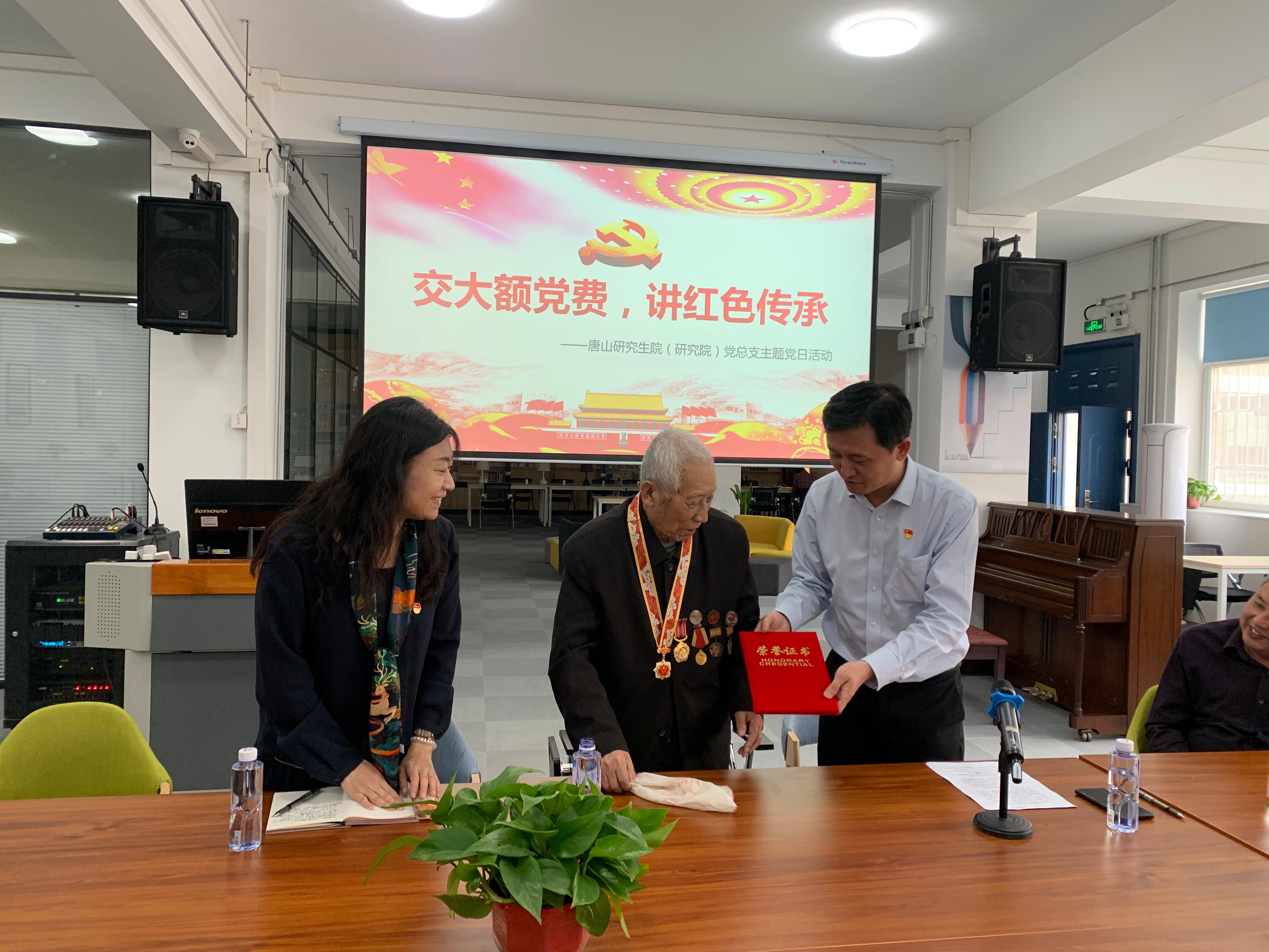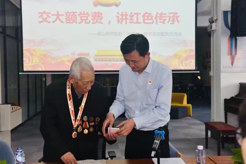 513日下午,唐山研究生院(研究院)党总支举办了一次特别的主题党日活动:耄耋党员张恩臣老师为党庆生,向党组织交上了一笔特殊的党费。唐山研究生院(研究院)师生党员代表参加此次活动。