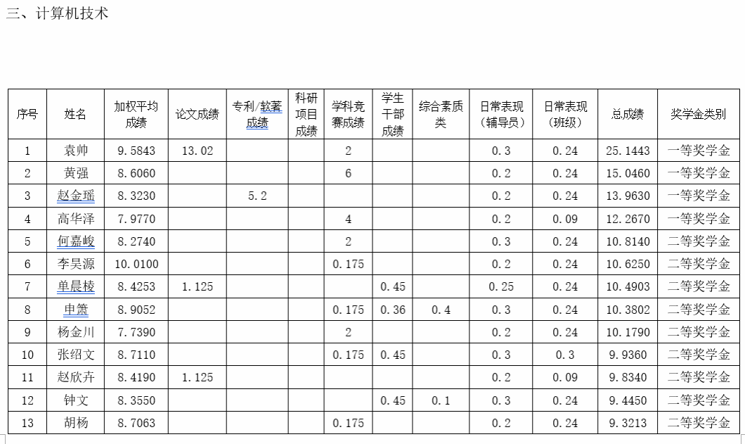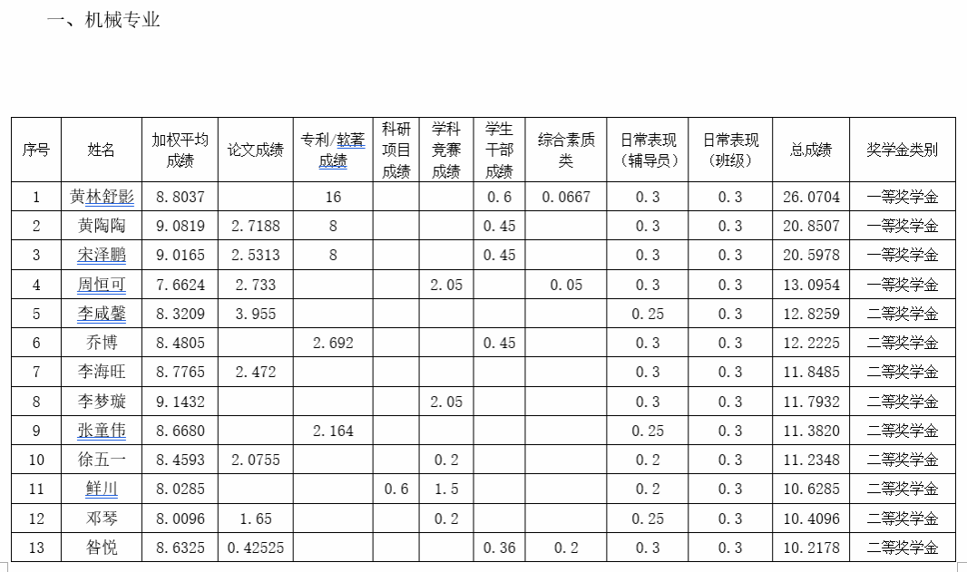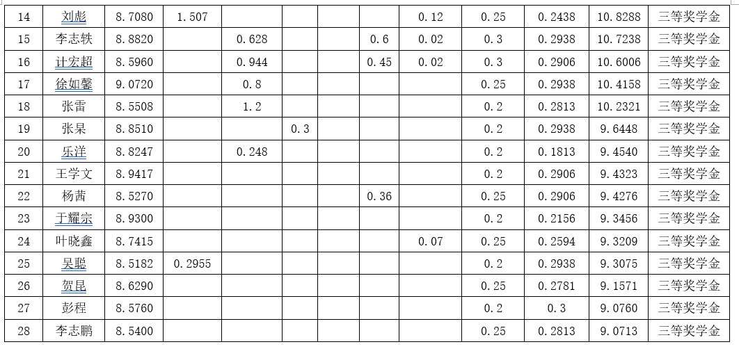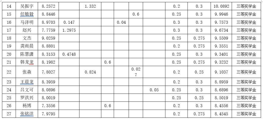 根据《春满四合院 研究生奖(助)学金评定办法》,按综合成绩排名确定最终获奖类别(综合成绩=学业成果成绩+思想道德素质评价成绩+第二学年综合成绩*10%),现将2021级2022-2023学年研究生学业奖学金获奖名单公示如下: