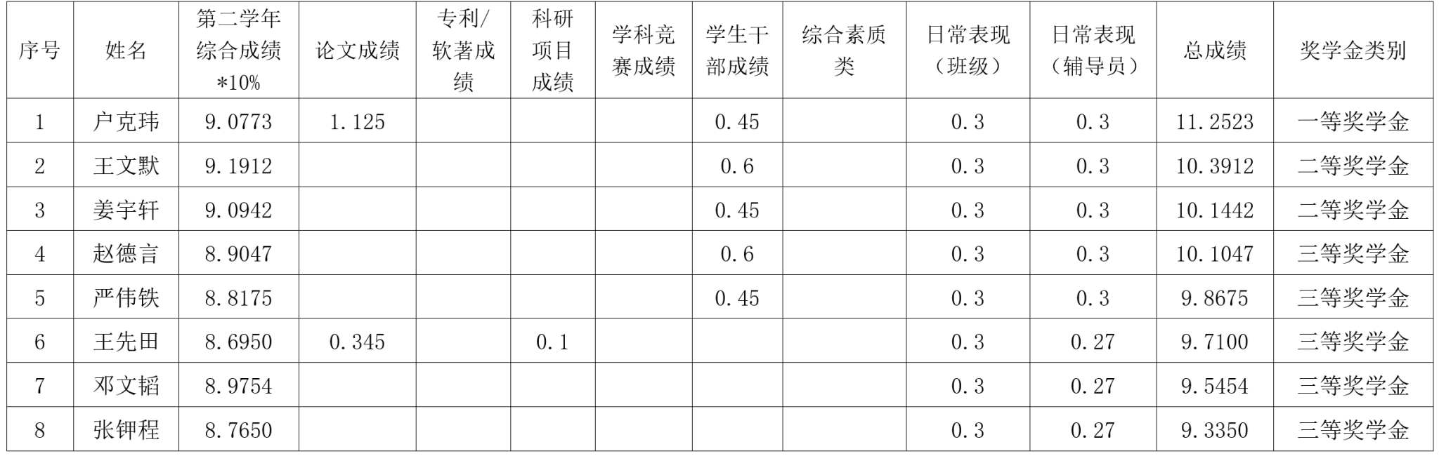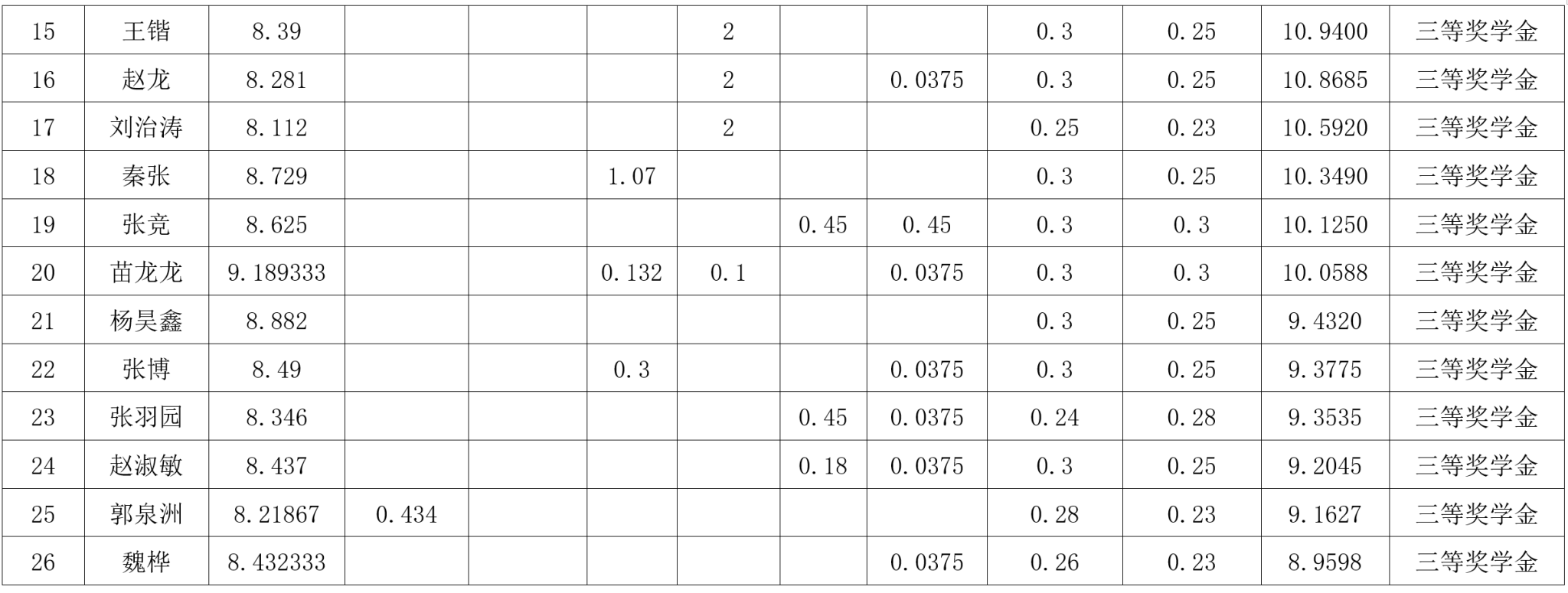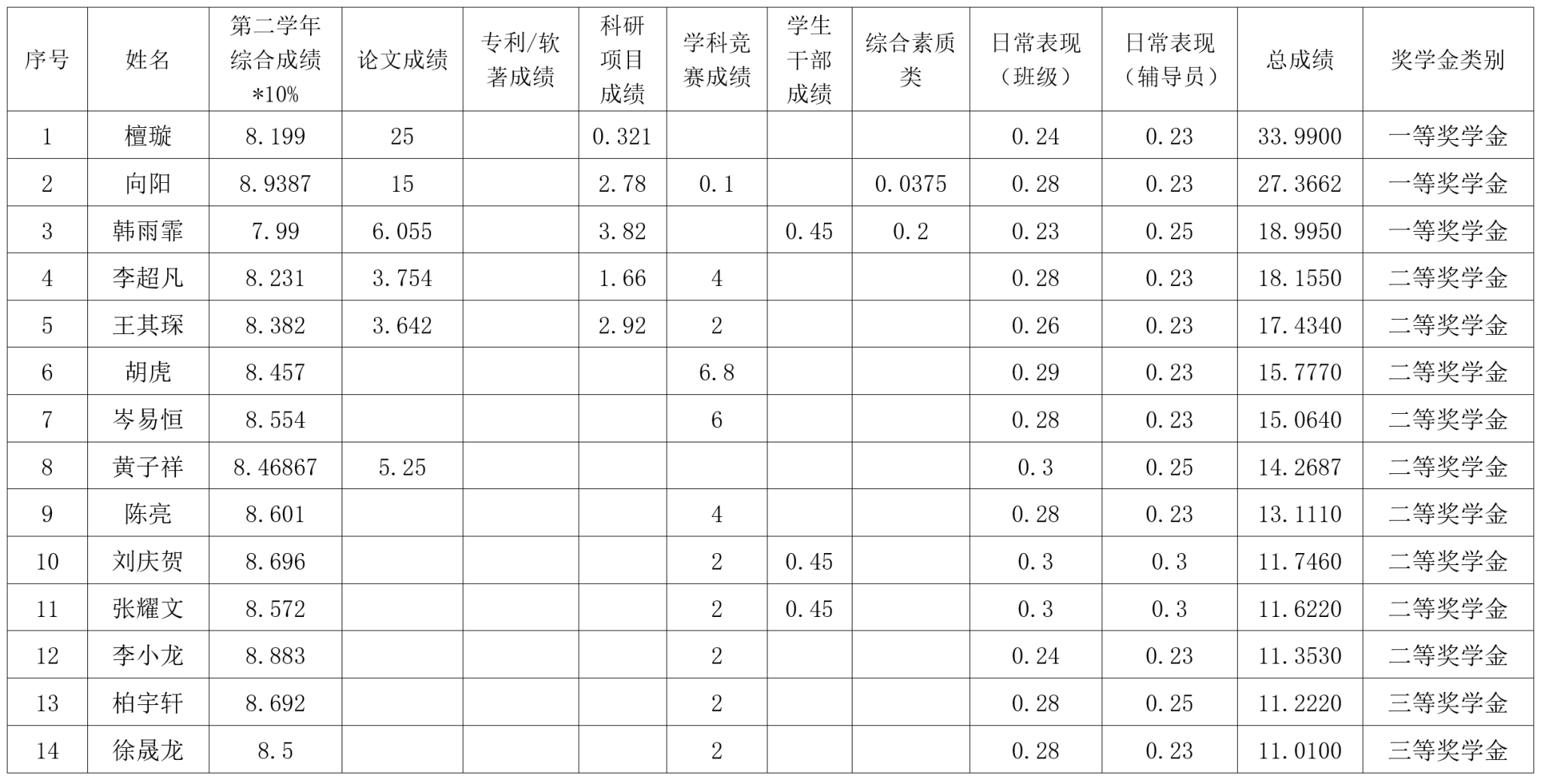 根据《春满四合院 研究生奖(助)学金评定办法》,按综合成绩排名确定最终获奖类别(综合成绩=学业成果成绩+思想道德素质评价成绩+第二学年综合成绩*10%),现将2022级2023-2024学年研究生学业奖学金获奖名单公示如下