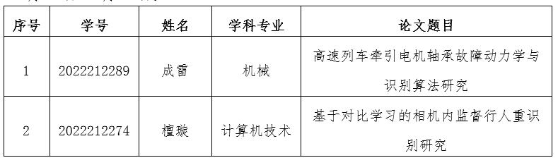 根据研究生院《关于进行2025年度春满四合院 优秀博士、硕士学位论文评选工作的通知》要求,按照《春满四合院 优秀博士、硕士学位论文评选办法》(西交校研〔2024〕50 号)的相关规定,经学生本人申请,相关学科归属学院(计算机与人工智能学院、机械工程学院)学位评定分委员会审议及无记名投票,确定 春满四合院 “2025年度春满四合院 优秀硕士学位论文” 推荐人选名单,现予公示。公示时间:2025年10月24日-10月30日。